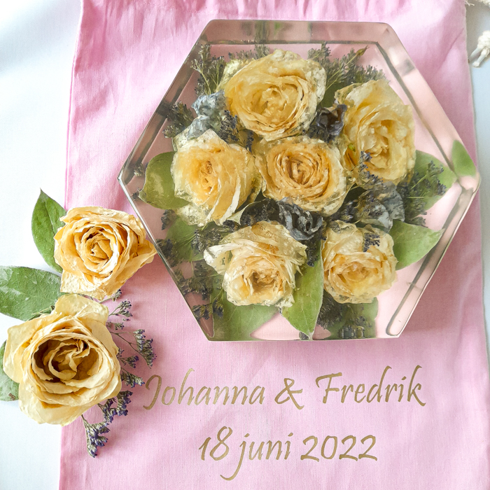 Hur går det till? Direkt efter ditt bröllop behöver blommorna skickas till Monika. Hon behöver dem medan de fortfarande är så färska och vackra som möjligt. Hon förklarar att man måste torka blommorna på ett visst sätt för att de ska torka vackert. Som amatör hänger man kanske oftast blommorna upp och ned, i ett försök att föreviga dem. Men då torkar ju också blommorna så som de hänger. De blir ju mycket vackrare om de torkas åt rätt håll. Men innan den processen startar så måste hon förbereda buketten. För när blommorna väl är torkade är de väldigt ömtåliga. När blommorna är förberedda och torra är det dags för layouten. När både kund och Monika är nöjda är det dags att gjuta in blommorna. Sedan är det dags för polering och du som kund väljer hur du vill att baksidan ska se ut, svart, vit eller genomskinlig. Ni kan också välja att lägga till era namn och datum eller annan text. När buketten nu är färdig är det dags för leverans. Hela processen är ett hantverk som förtjänar respekt och tar mellan 3-8 månader. Men det är helt klart värt väntan. Buketten levereras i en vacker tygpåse och du kan njuta av buketten varje dag för all framtid.
