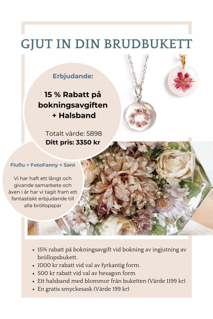 Det är väldigt roligt att få berätta att om du bokar mig som din bröllopsfotograf under 2024. Så får du en rabattkod som du kan använda för att gjuta in din bukett hos Monika. Snacka om två flugor i en smäll. Rabattkoden ger dig 15% rabatt på bokningsavgiften + ett halsband med blommor från brudbuketten. Exklusivt är att du dessutom kan välja en av dina bröllopsbilder att gjuta in tillsammans med din bukett. Det blir personligare, unikare och fantastiskt vackert. Visst är det svårt att motstå?