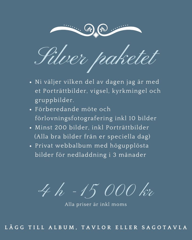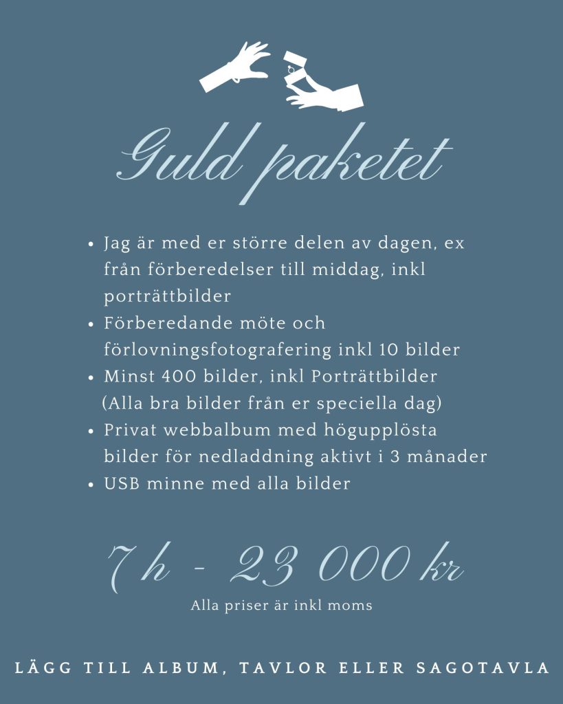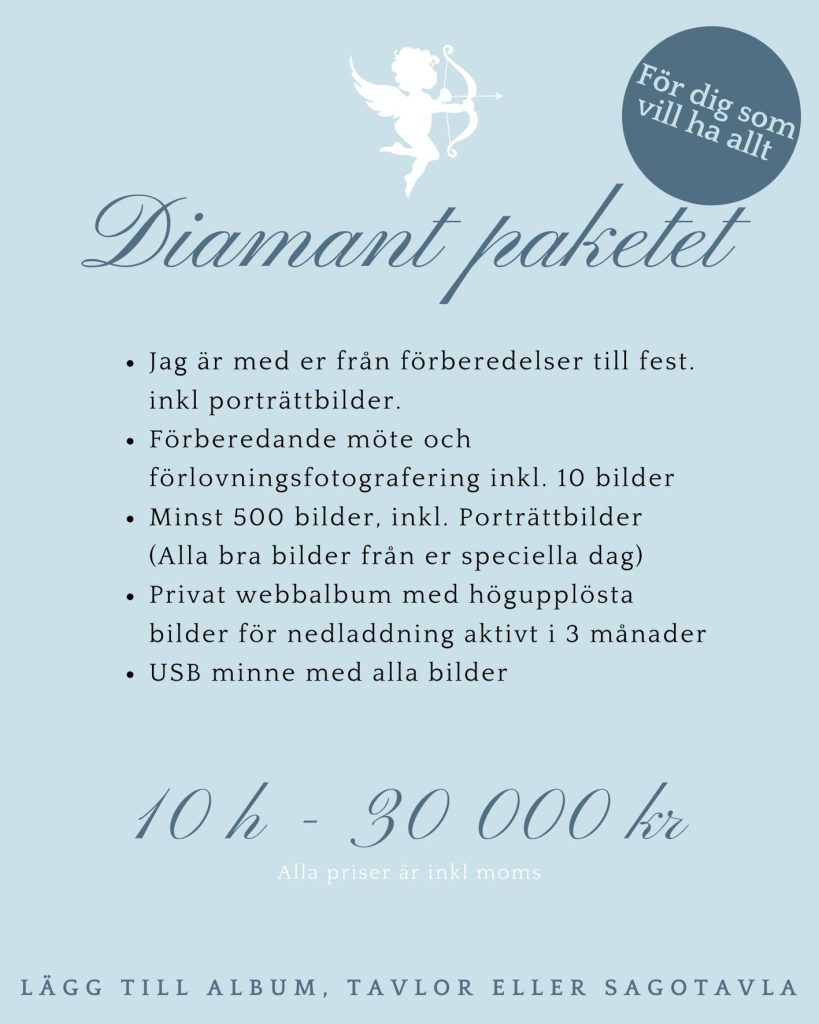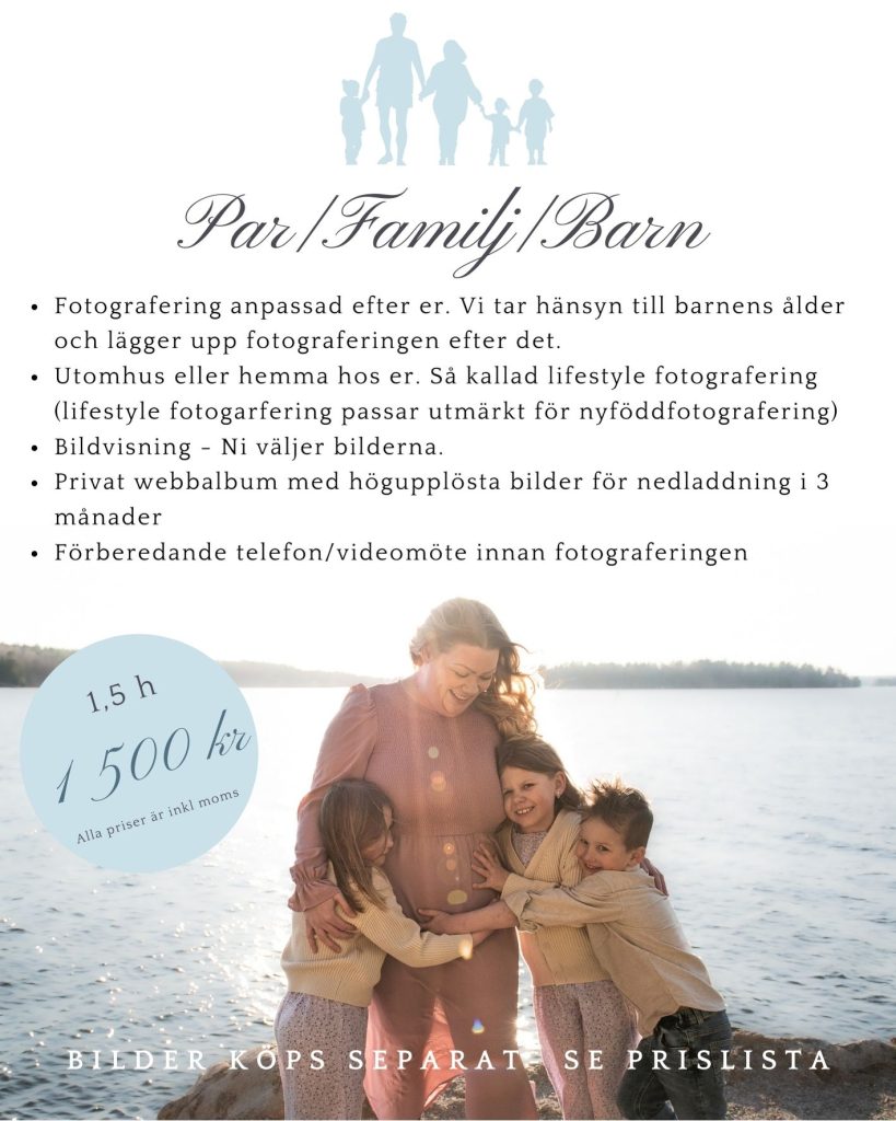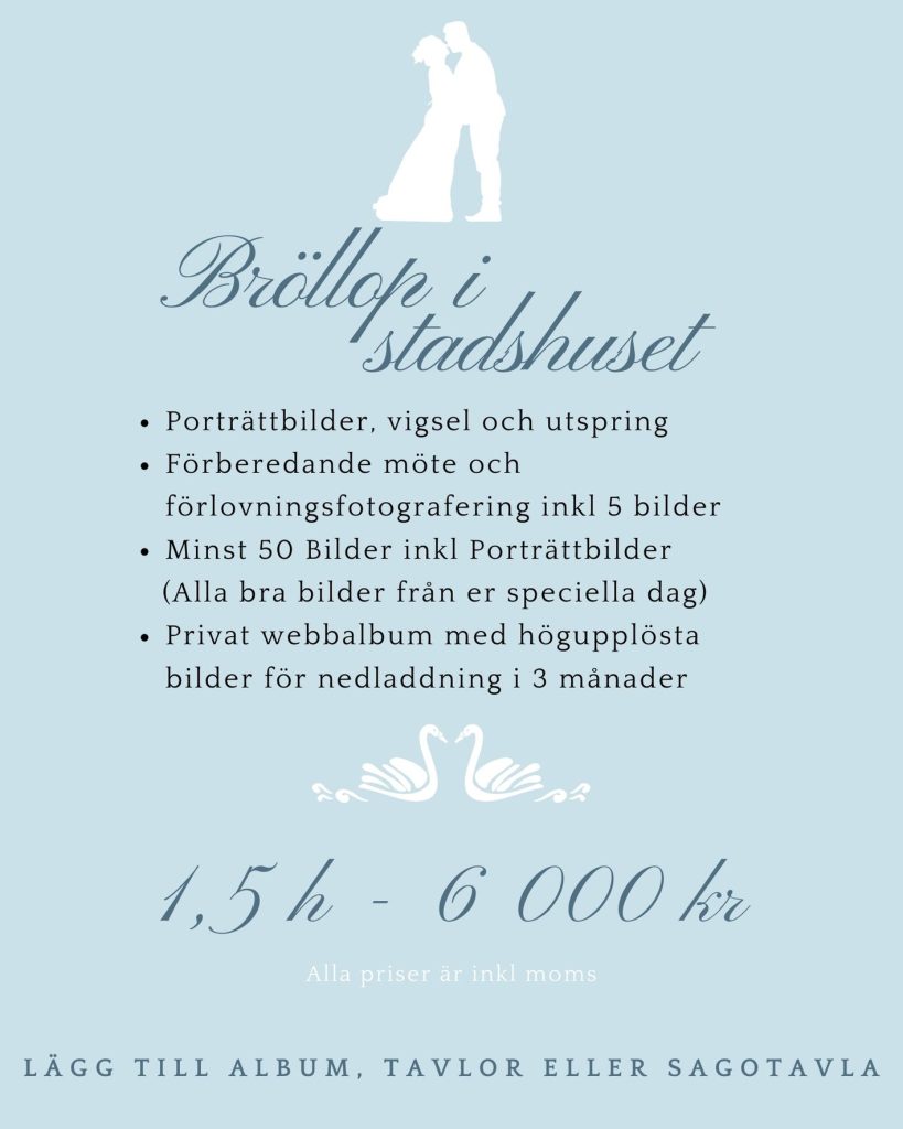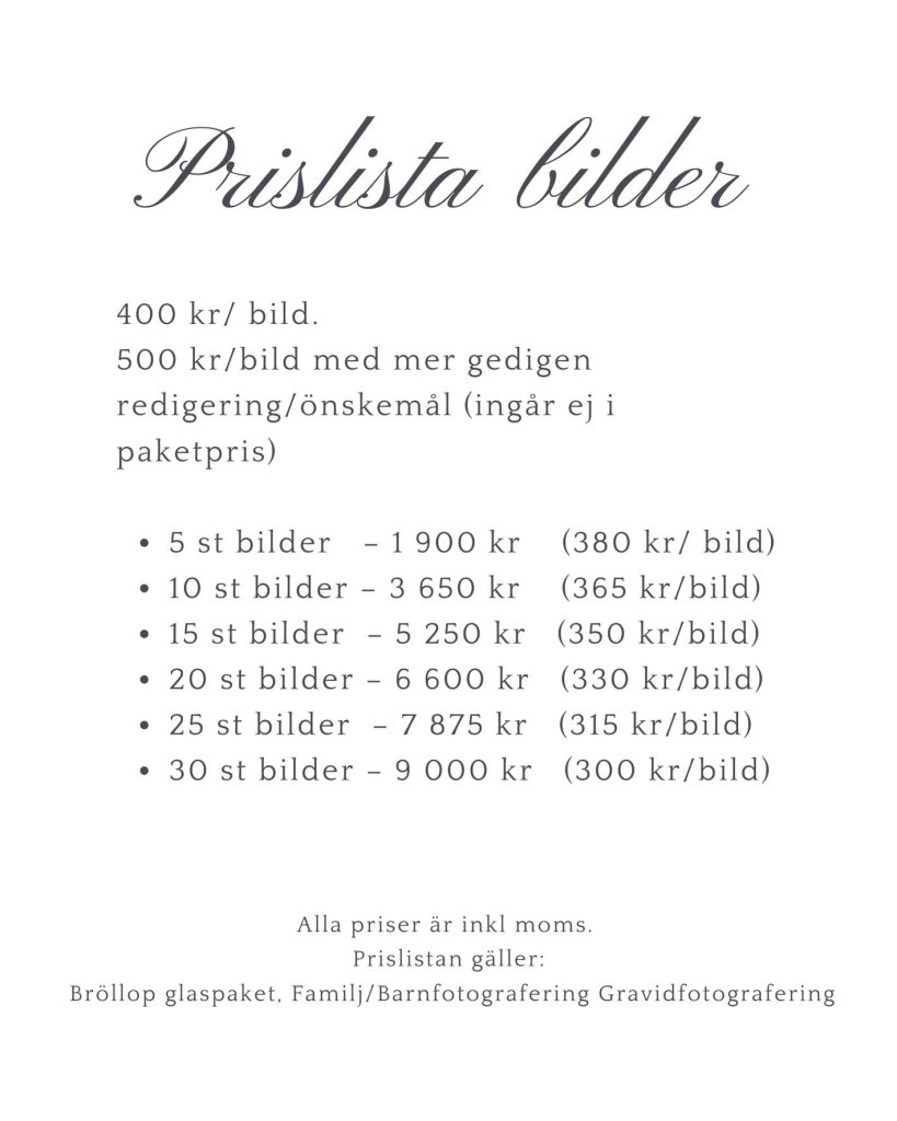 Alla priser är inkl moms. Reseersättning kan tillkomma vid gravid och familjefotograferingar. Vid resa över 2 h enkel resa tillkommer boende-och logistikkostnader. Om du inte hittar det du letar efter nedan, skicka en förfrågan på mejl så återkommer jag med ett prisförslag. Taleandart@outlook.com
